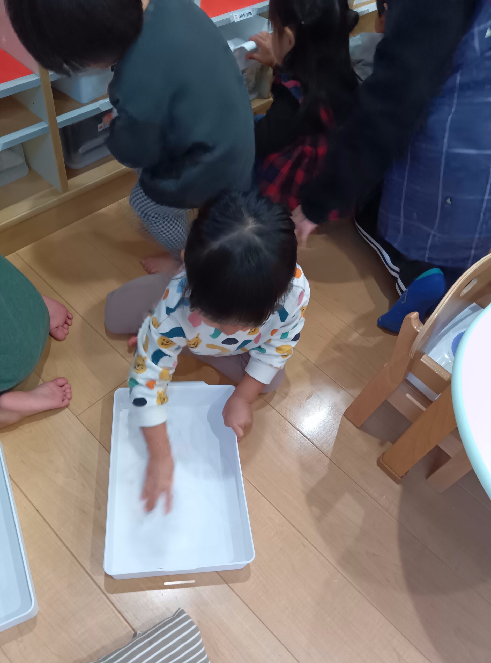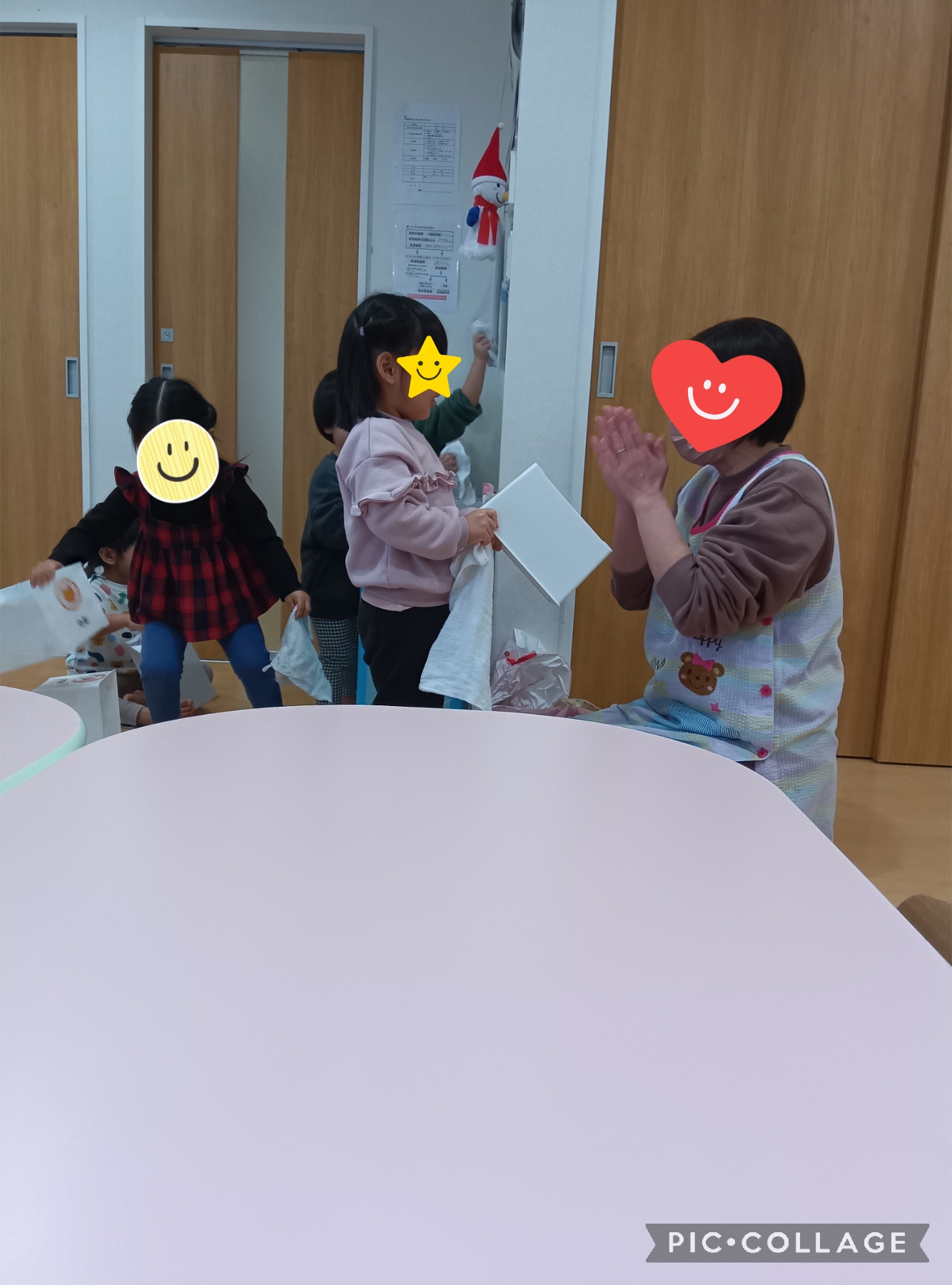 年末なのでみんなで大掃除ごっこをしました。雑巾を持って自分のロッカーや洗濯物を入れる箱をピカピカに拭きました。