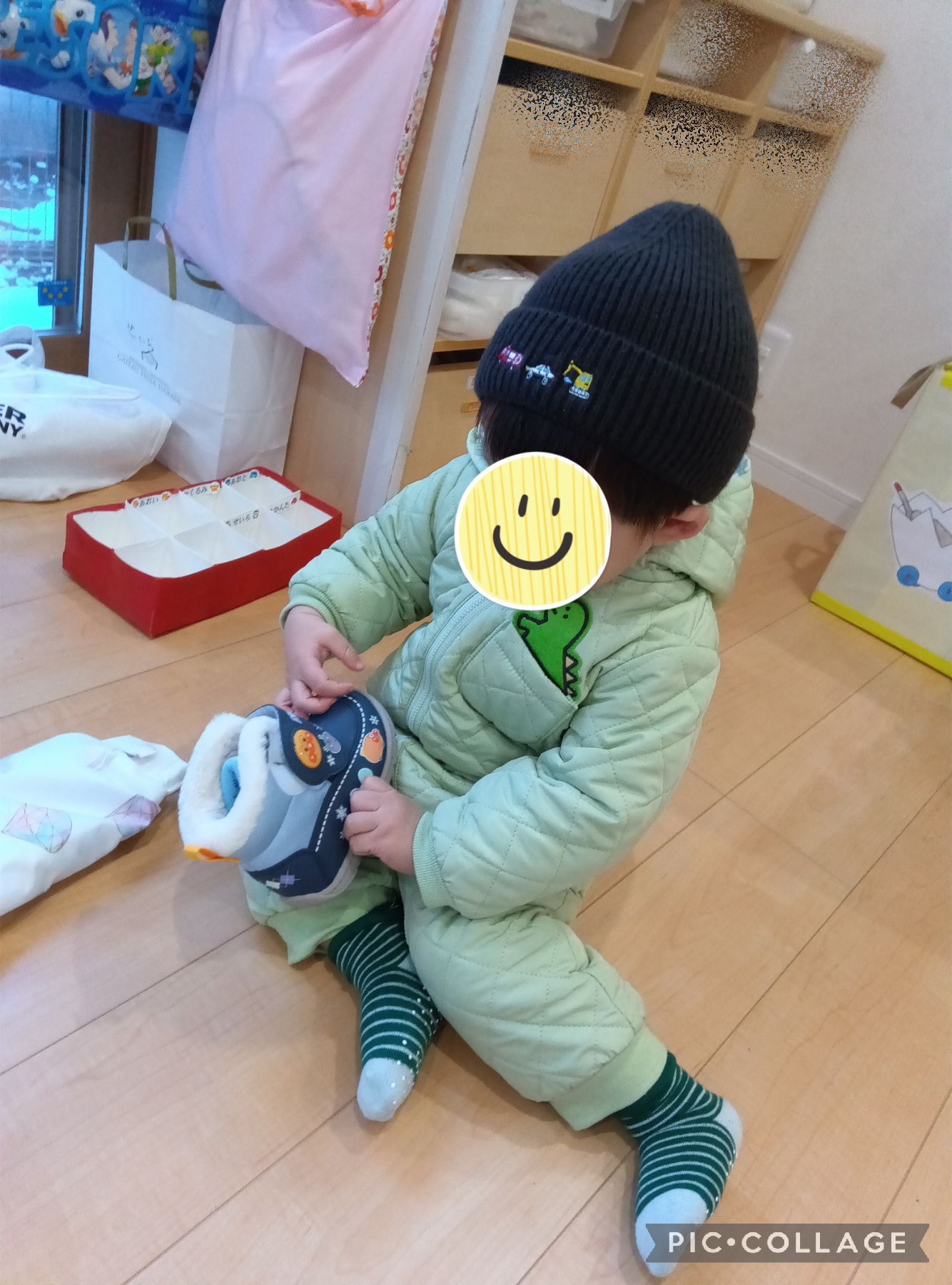 スキーウエアーやブーツを着用すると自分の好きなキャラクターを見つけて嬉しそうに教えてくれ、ニヤニヤがとまらず良い笑顔。