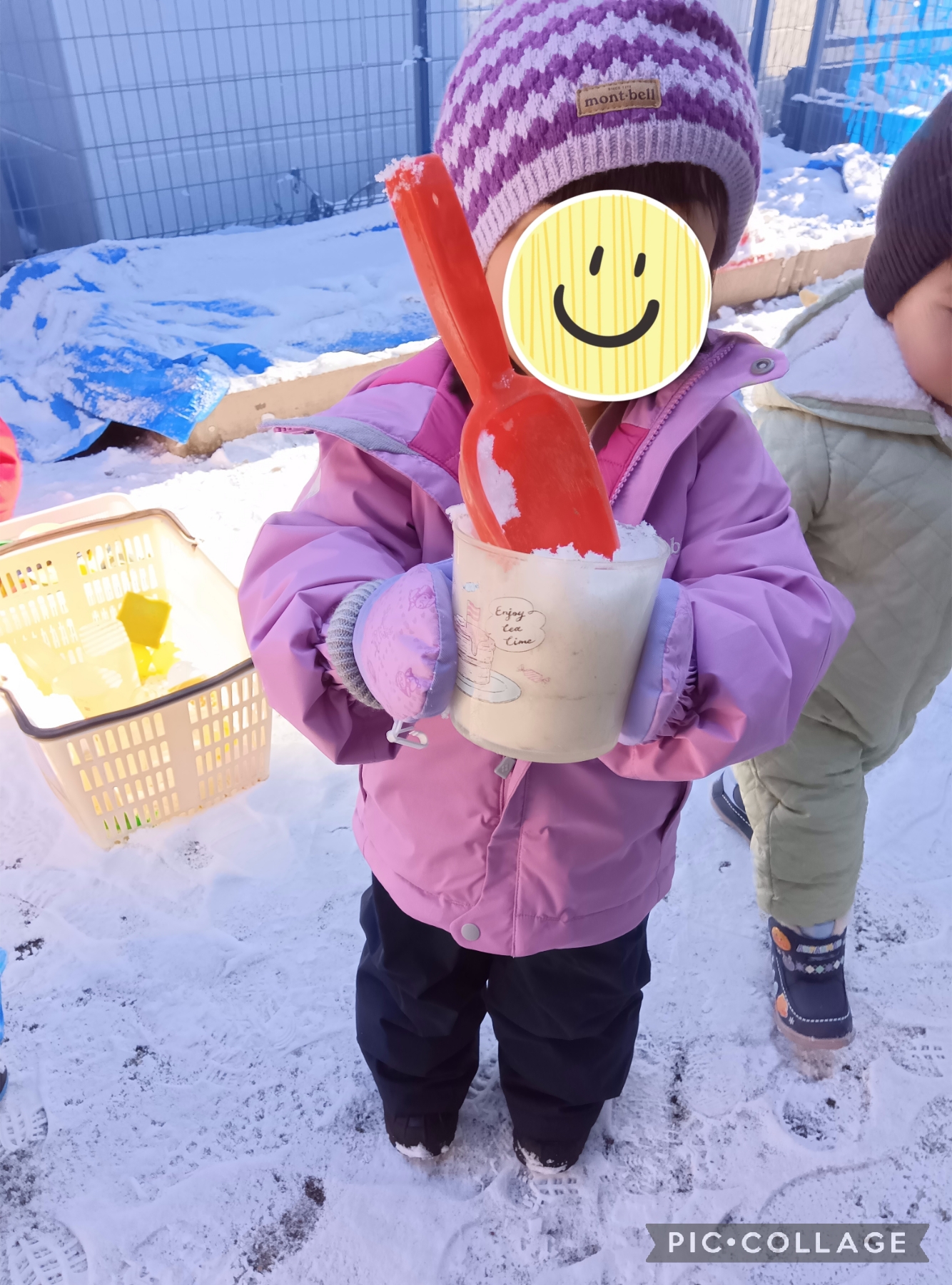 また、雪をたくさん集めて「かき氷!」を作っていました。「いらっしゃいませ!何にしますか?」とお友だちや保育者みんなに聞いて真剣になって食べたいかき氷を作ってくれました。