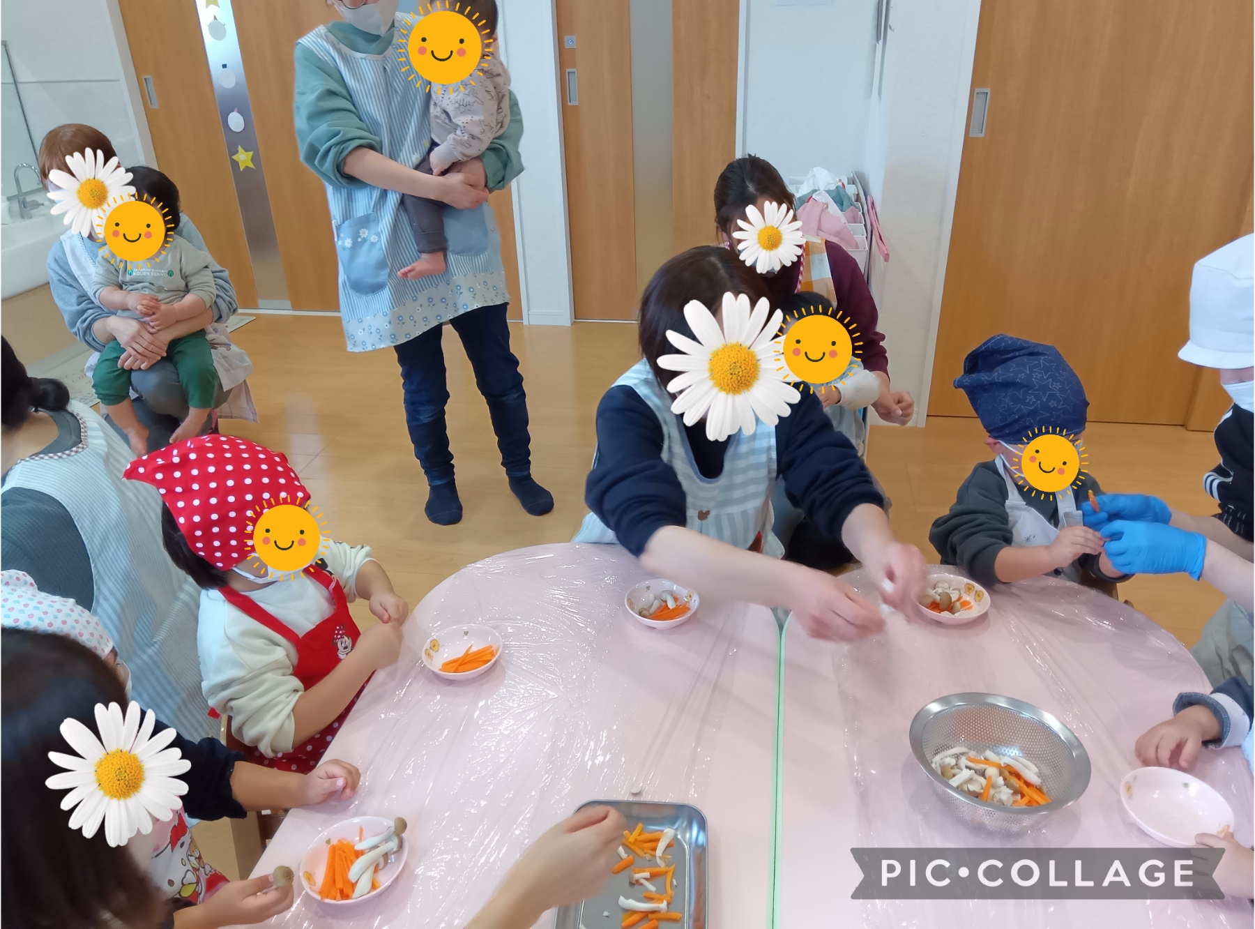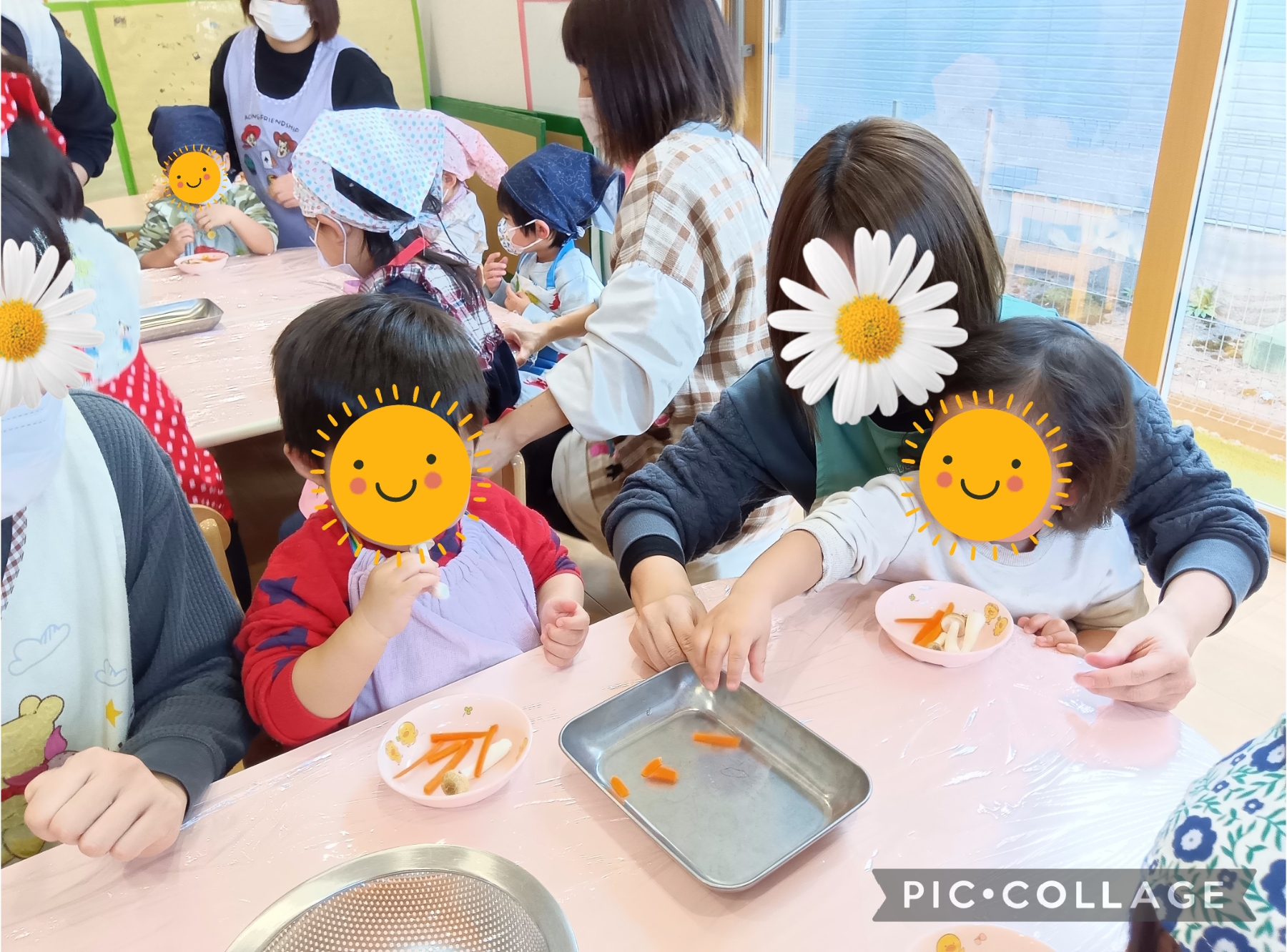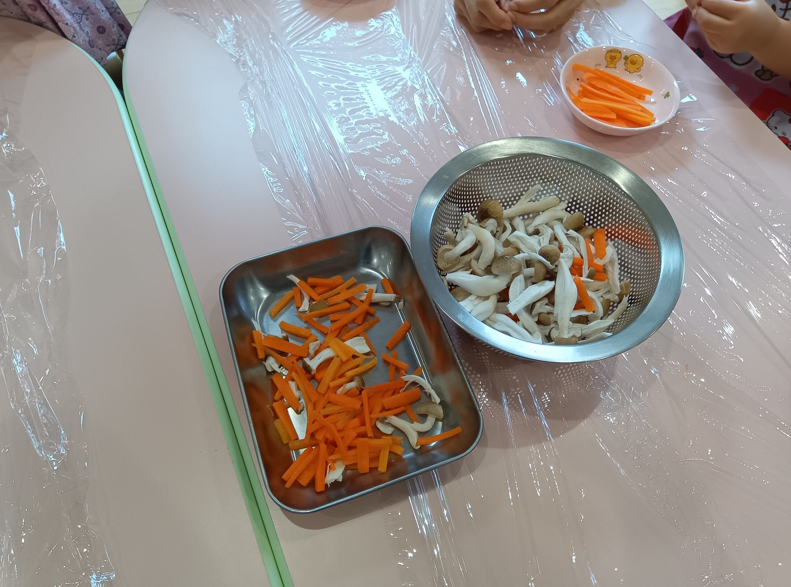 いちごさんとみかんさんは人参をポキポキ折ってみたり、しめじをさいていきながら野菜の匂いや感触を楽しんでいました。
