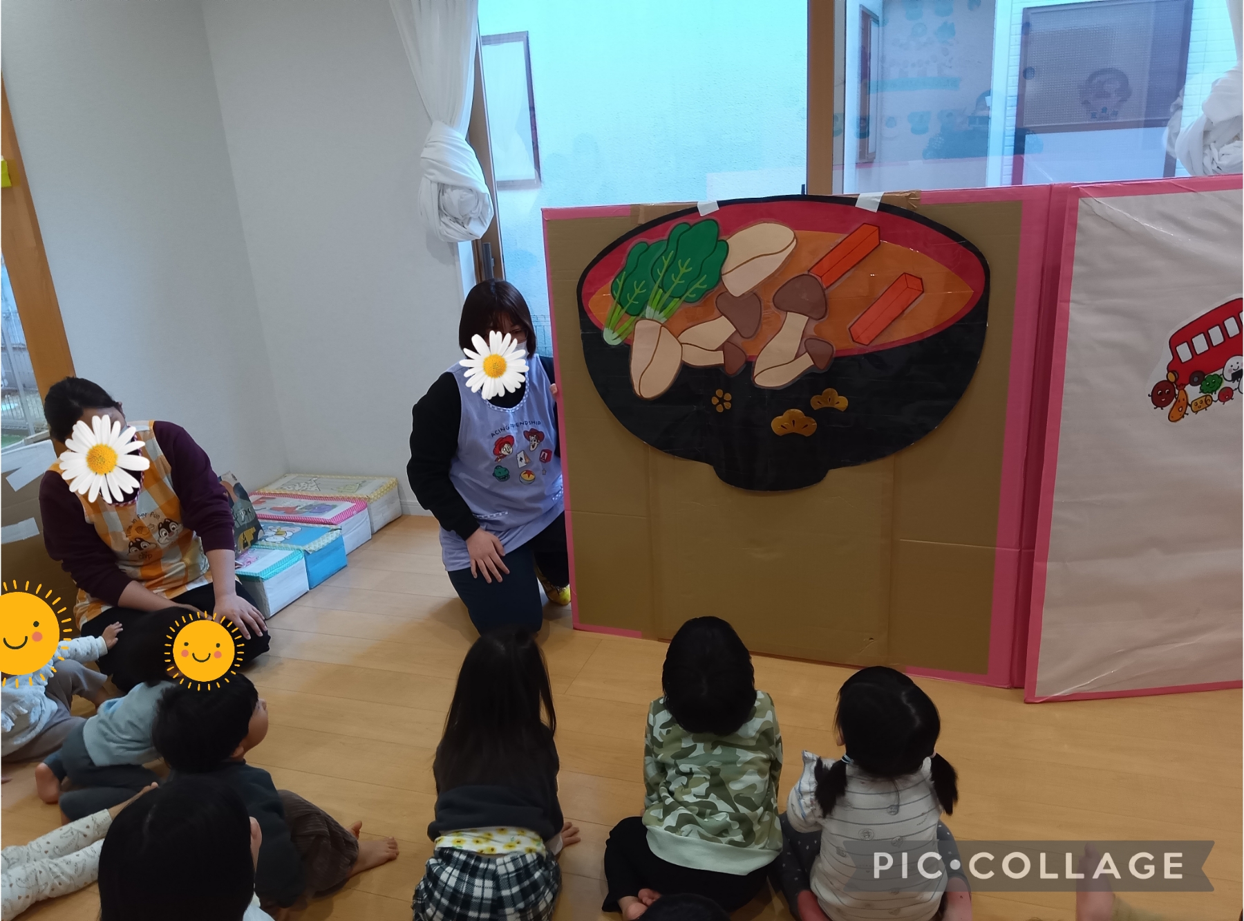 大きなイラストを見ながらほうれん草・しめじ・にんじん・鶏肉が入ることを知り、みんな興味津々。